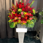 店頭に飾れる大ぶりな花は、祝意を形にしやすく目立ちます。ほとんどのスタンド花はリースして短期間飾るものなので、お花屋さんが配送して、撤去まで担当してくれて、贈り先への手間はありません。